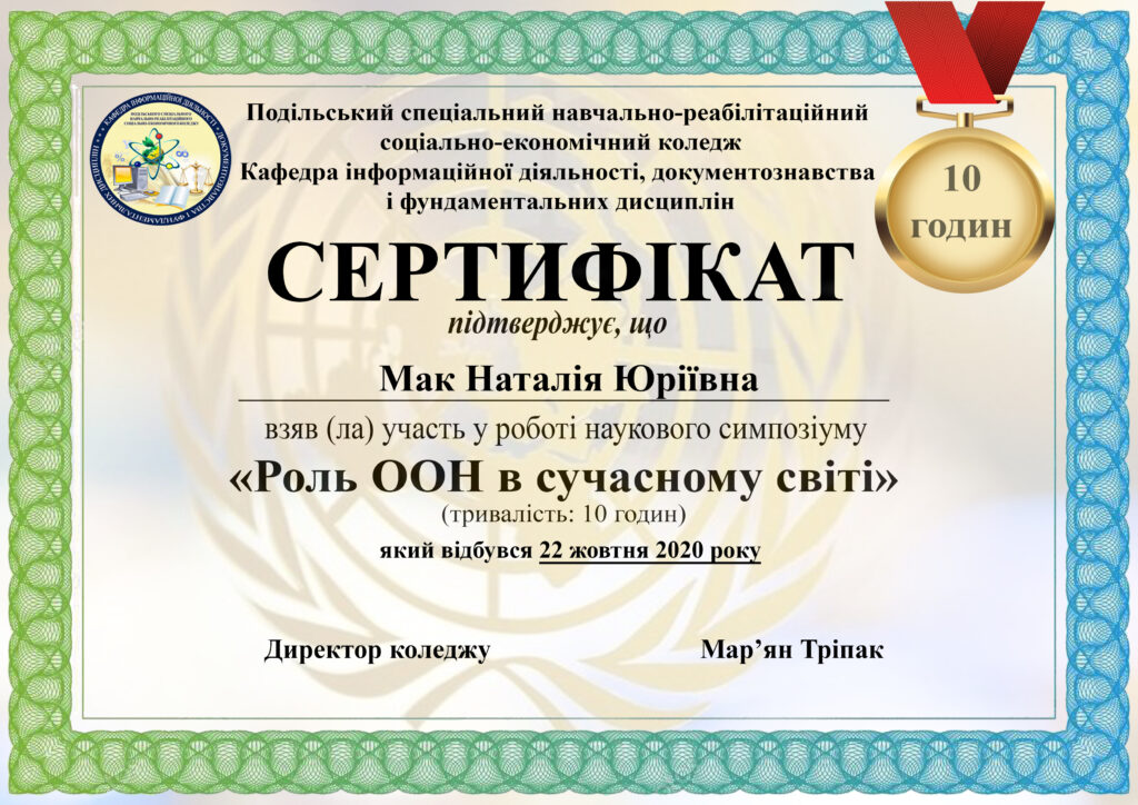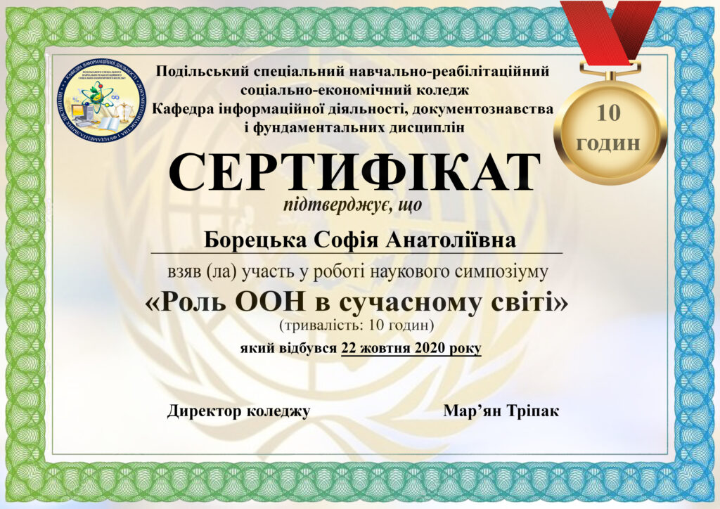 22 жовтня 2020 року відбувся науковий симпозіум “Роль ООН в сучасному світі” присвячений 75-річчю від дня заснування Організації Об’єднаних Націй. Відрадно, що участь у ньому взяли студенти історичного факультету спеціальності «історія і правознавство» Борецька Софія Анатоліївна, Мак Наталія Юріївна і Чорний Сергій Віталійович. Їхні доповіді були присвячені позиції СРСР під час процесу створення Організації Об’єднаних Націй (Борецька С.А.), програмі ООН з навколишнього середовища (ЮНЕП) (Мак Н.Ю.) й договору нерозповсюдження ядерної зброї (Чорний С.В.). Хочемо побажати студентам не спинятися на досягнутому та опановувати нові вершини на науковій ниві!