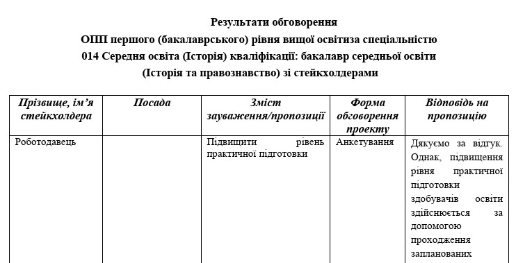 РЕЗУЛЬТАТИ ОБГОВОРЕННЯ ОПП Новини 05.01.202311.11.2025 Баженов Олександр Пропонуємо вашій увазі результати обговорення ОПП першого (бакалаврського) рівня вищої освіти за спеціальністю 014 Середня освіта (Історія) кваліфікації: бакалавр середньої освіти (Історія та правознавство) зі стейкхолдерами.
