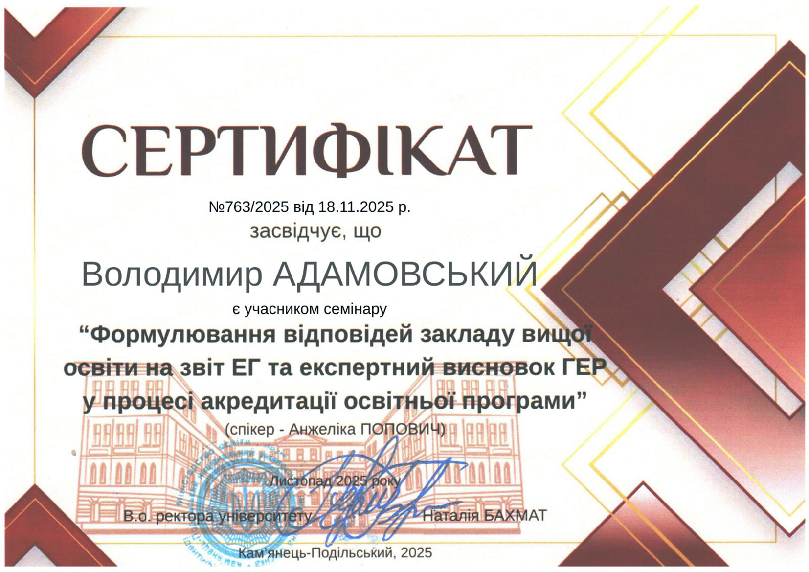 Сертифікат №763/2025 від 18.11.2025 р. засвідчує, що Володимир АДАМОВСЬКИЙ є учасником семінару «Формулювання відповідей закладу вищої освіти на звіт ЕГ та експертний висновок ГЕР у процесі акредитації освітньої програми» (спікер – Анжеліка ПОПОВИЧ). Листопад 2025 року.