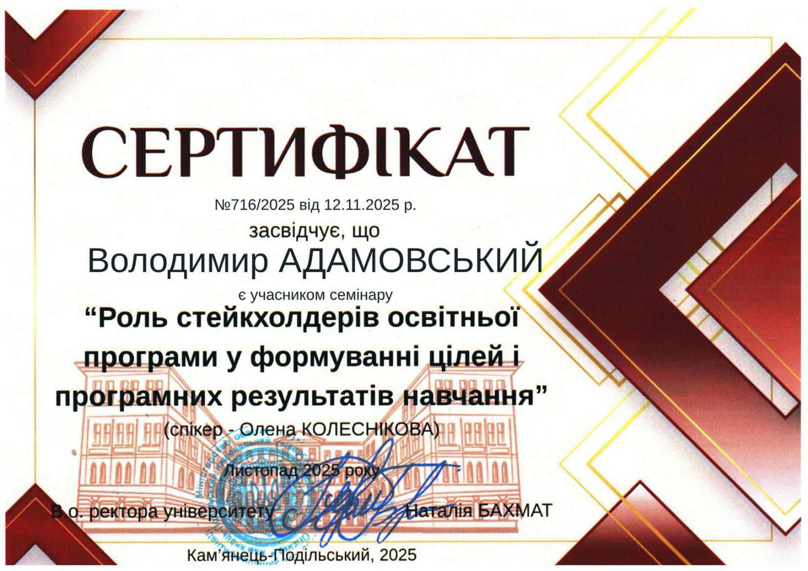 Сертифікат №716/2025 від 12.11.2025 р. засвідчує, що Володимир АДАМОВСЬКИЙ є учасником семінару «Роль стейкхолдерів освітньої програми у формуванні цілей і програмних результатів навчання» (спікер – Олена КОЛЄСНІКОВА). Лиспад 2025 року.