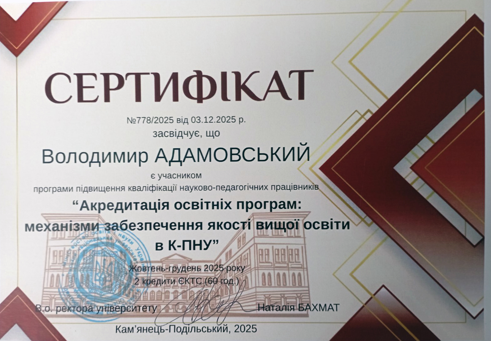 Сертифікат №778/2025 від 03.12.2025 засвідчує, що Володимир АДАМОВСЬКИЙ є учасником програми підвищення кваліфікації науково-педагогічних працівників «Акредитація освітніх програм: механізми забезпечення якості вищої освіти в К-ПНУ» Жовтень-грудень 2025 року 2 кредити ЄКТС (60 год.)